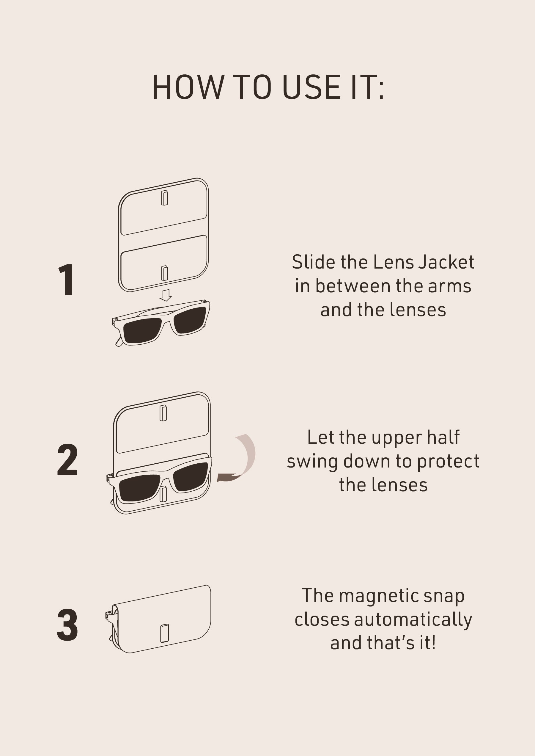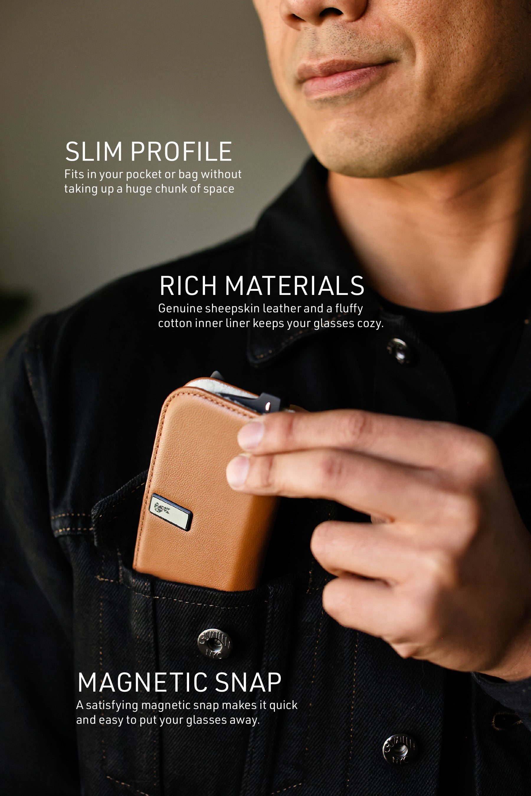 The Lens Jacket is an ultra-lightweight solution to bulky and cumbersome clamshell glasses cases. It's much slimmer than a typical case but more protective than a sleeve. The product is made from real sheepskin leather and fuzzy cotton liner and uses two strong magnets to hold and protect your glasses. Slips into your pocket, purse, or backpack with ease and a footprint you’ll barely notice.